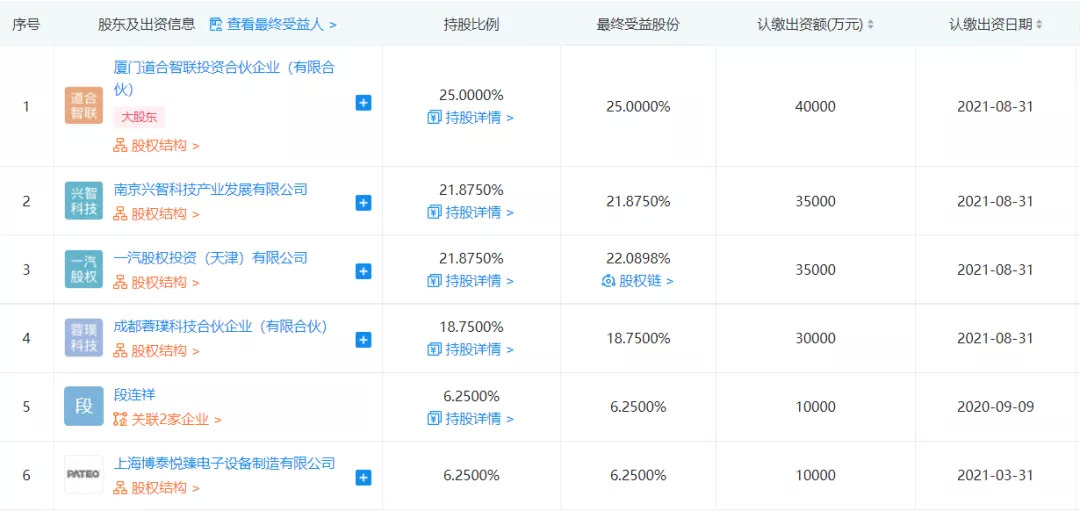 据企查查信息显示,南京盛腾注册资本为15亿元,由段连祥、成都蓉璞科技合伙企业(有限合伙)、南京兴智科技产业发展有限公司、一汽股权投资(天津)有限公司、厦门道合智联投资合伙企业(有限合伙)5个股东出资成立。