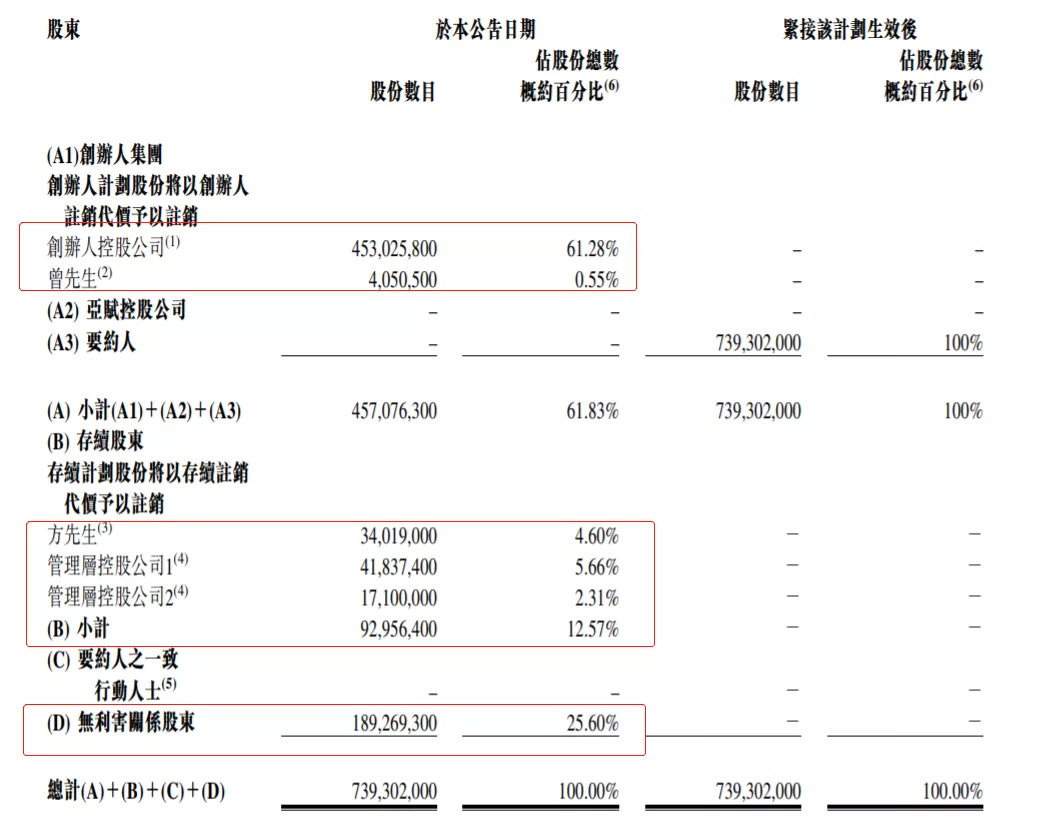 需要注意的是,整个私有化过程,并不需要大股东曾勇出钱,而是由亚赋基金出资5.3亿港元,从公众股东手中买下25.6%的股权。同时,以配发股份的方式,交换存续股东所持有的12.57%股权。