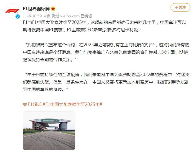 @F1世界锦标赛 11月6日宣布,F1与F1中国大奖赛续约至2025年,这项新的合同能确保未来的几年里,中国车迷可以期待恢复中国F1赛事。