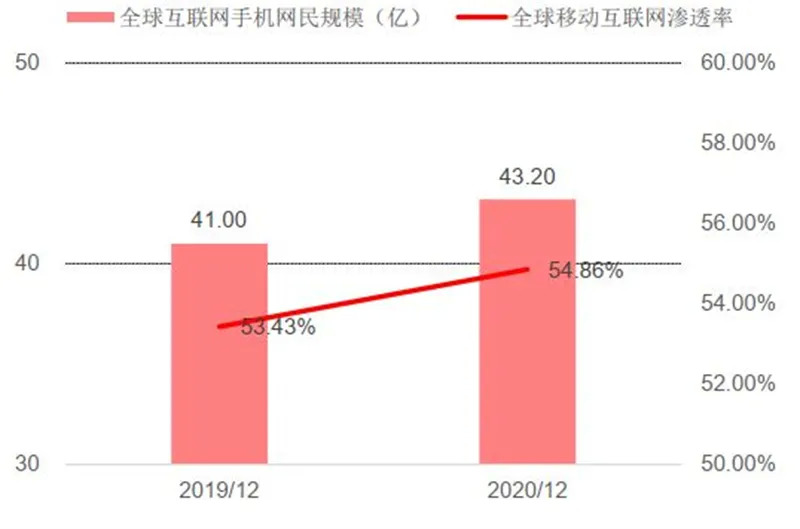 回顾移动互联网的发展历程,最重要的指标为移动互联网渗透率和用户时长,它们代表移动互联网的流量,基于这些流量产生收益。根据国际电信联盟,2020年全球移动互联网用户为43.2亿,渗透率为54.68%。在2020年疫情催化下,移动互联网的渗透率并未出现较高的增长。