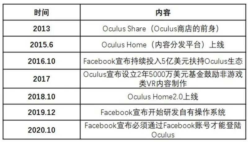 应用端加强生态扶持。2016年10月,Facebook宣布投入5亿美元扶持Oculus内容生态,扶持项目全部由Oculus独占。根据Information,2019年12月,Facebook开始开发自有操作系统。