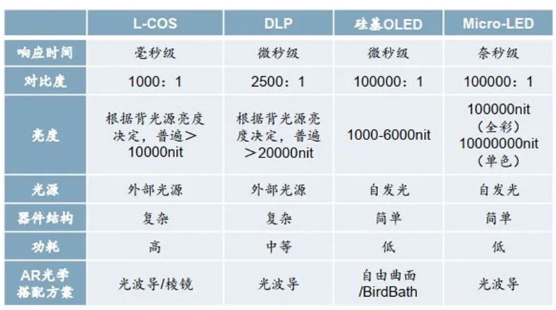 AR眼镜的光学系统由图像源器件与显示镜面两个主要配件构成,目前的搭配方案包括LCOS+光波导、DLP+光波导、硅基OLED+自由曲面等,市面上多种解决方案同时存在。
