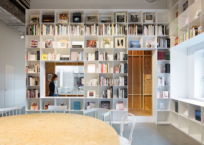 从最后的效果看,设计师想到了在图书馆的书架中间挖个洞,对准蛋糕店厨房的透明展示窗口,把两个空间关联起来。而两个空间中又留出了一道走廊,让空间之间还是有所区隔。