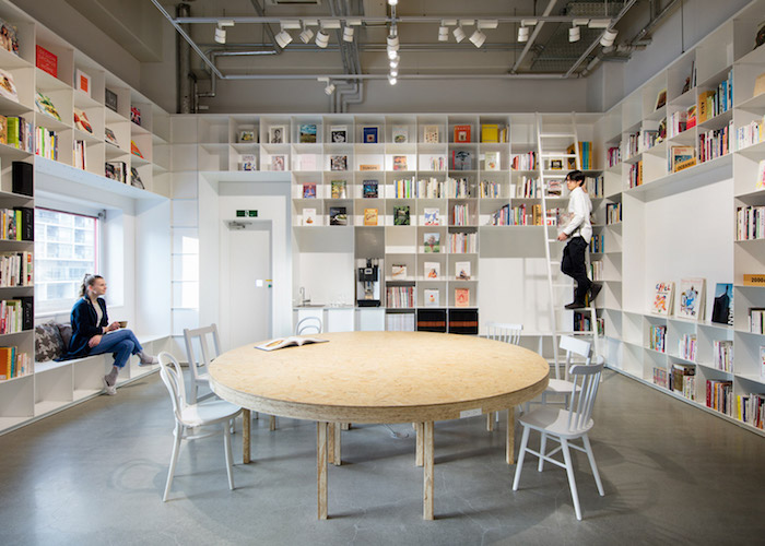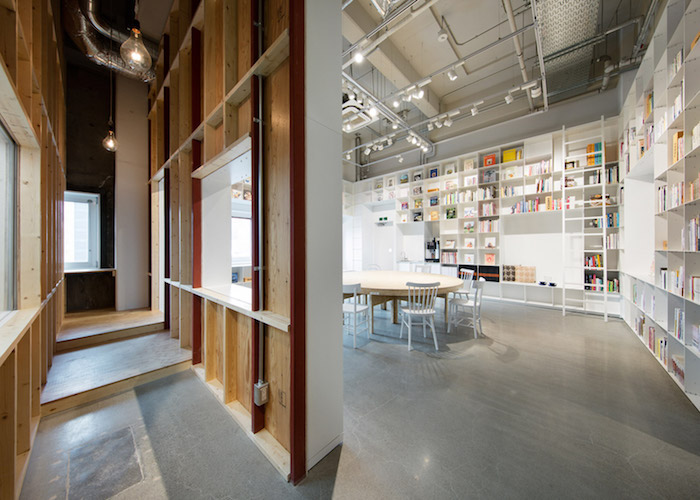 “图书馆和蛋糕店看上去非常的不相关,”建筑师在设计说明中写道,“所以我们要找到一个好的过渡方法。”