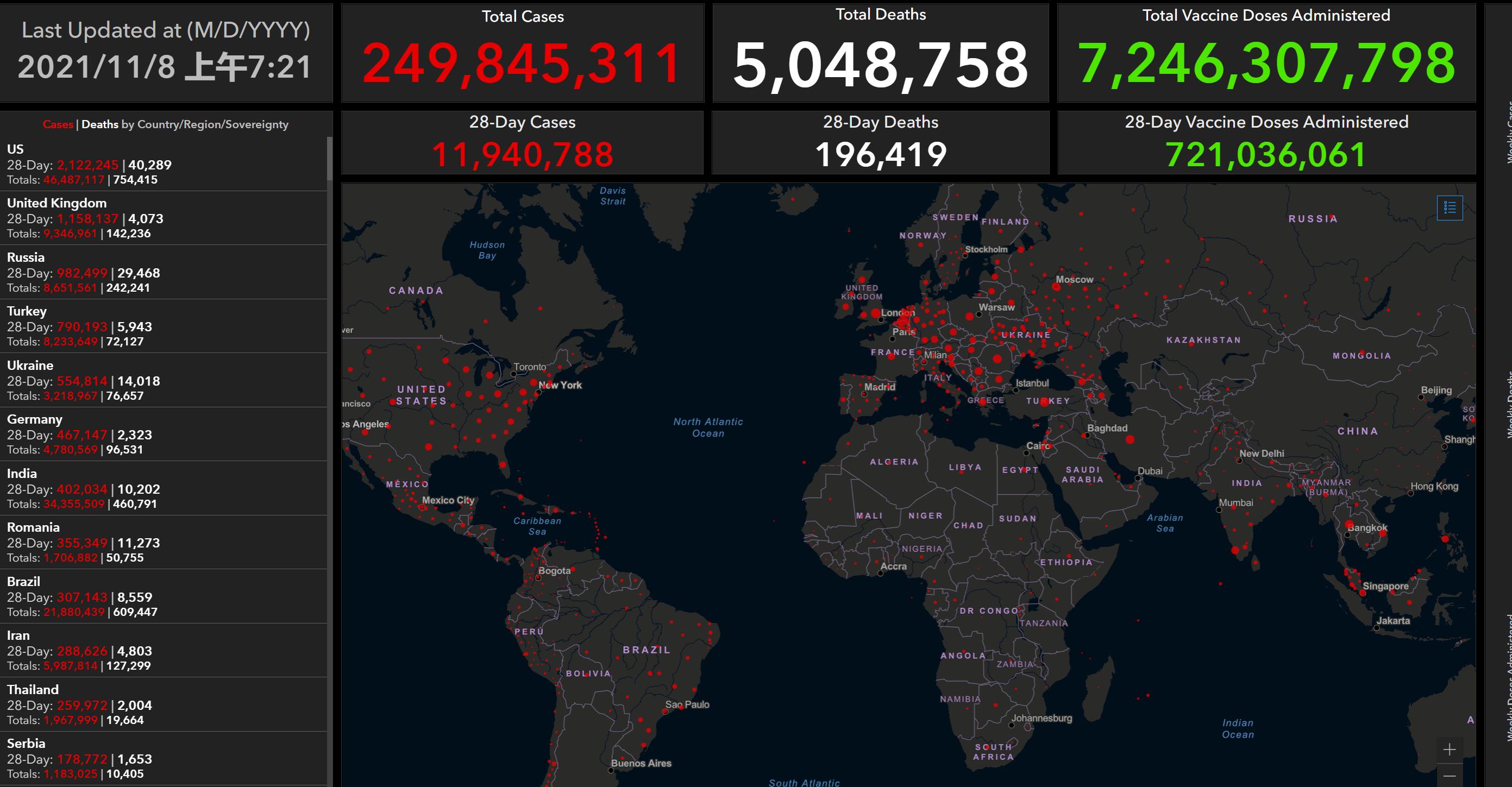 据约翰·霍普金斯大学的疫情追踪数据,截至北京时间11月8日上午8点,全球累计确诊新冠肺炎病例249845311例,累计死亡5048758例,接种疫苗超72.4亿剂次。