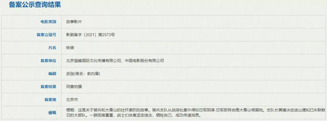 从影片的备案梗概来看,《铁骑》很有可能就是《我和我的父辈》里面《乘风》的扩充版。首先梗概里讲述的几乎是同一故事,另外编剧均为俞白眉,这两点几乎坐实了《铁骑》就是《乘风》。这一次吴京将把骑兵的故事真正的延伸开来,相信依然会有很大的看点。