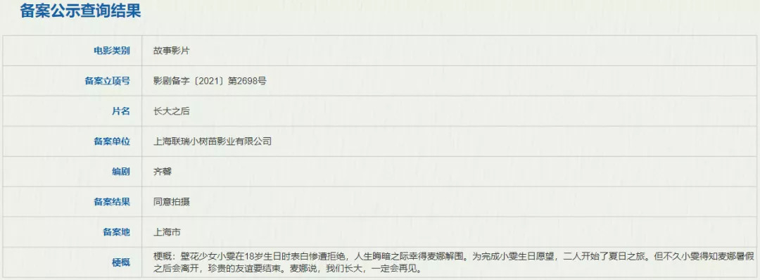 如今联瑞已经不再是单纯的发行公司,当然发行依然是它最为拿手的本领。国内大部分发行公司都在往上游转型,联瑞也不例外,在操盘了一系列大项目之后,这个由它亲自立项的《长大之后》颇为值得关注。从影片的立项梗概来看,影片关于友情,跟《七月与安生》的质感比较像。