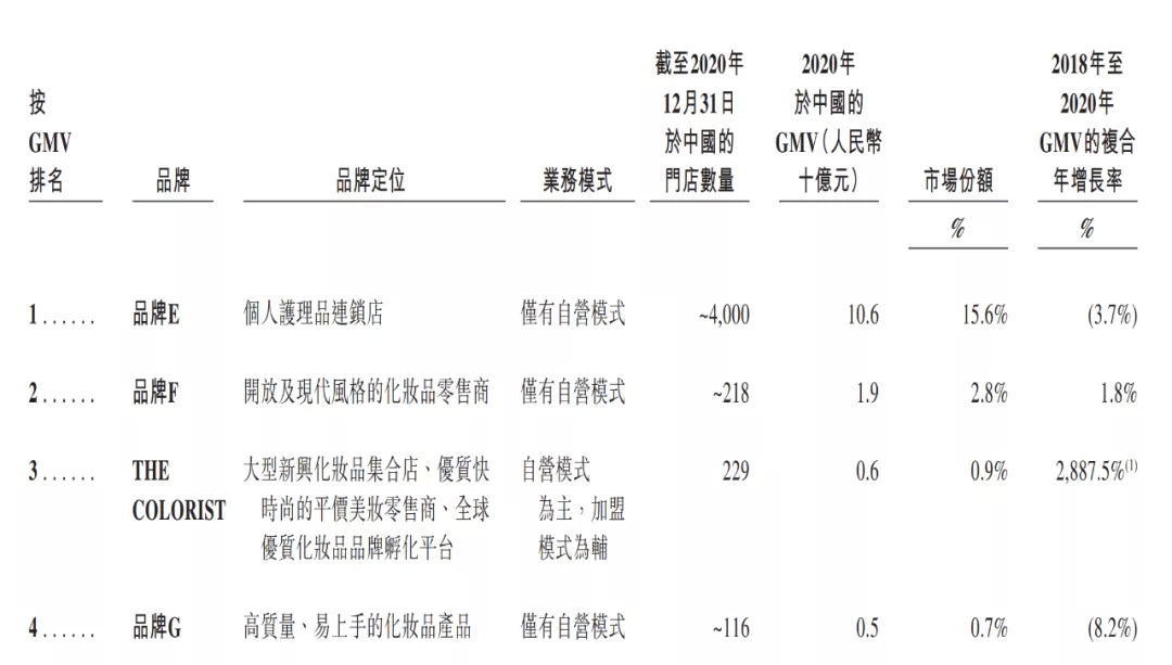 而在美妆潮流零售市场,THECOLORIST调色师表现不容小觑,2020年,其6亿规模的GMV,在中国美妆潮流零售商中位居第三,市场份额约为0.9%。此外,其GMV高达2887%的复合年增长率,远超主要竞争对手。