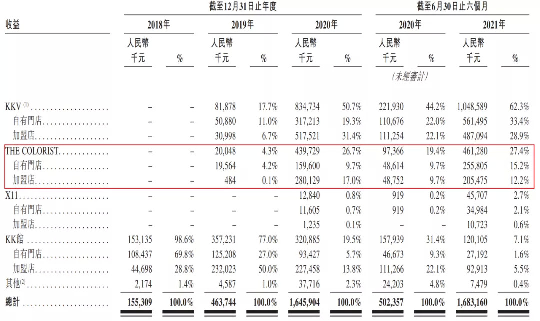 就营收贡献上来看,2019年,THE COLORIST调色师为集团贡献了4.3%的营收,而去年,这一占比攀升至26.7%,今年上半年更是提升至27.4%,贡献占比仅次于KKV。