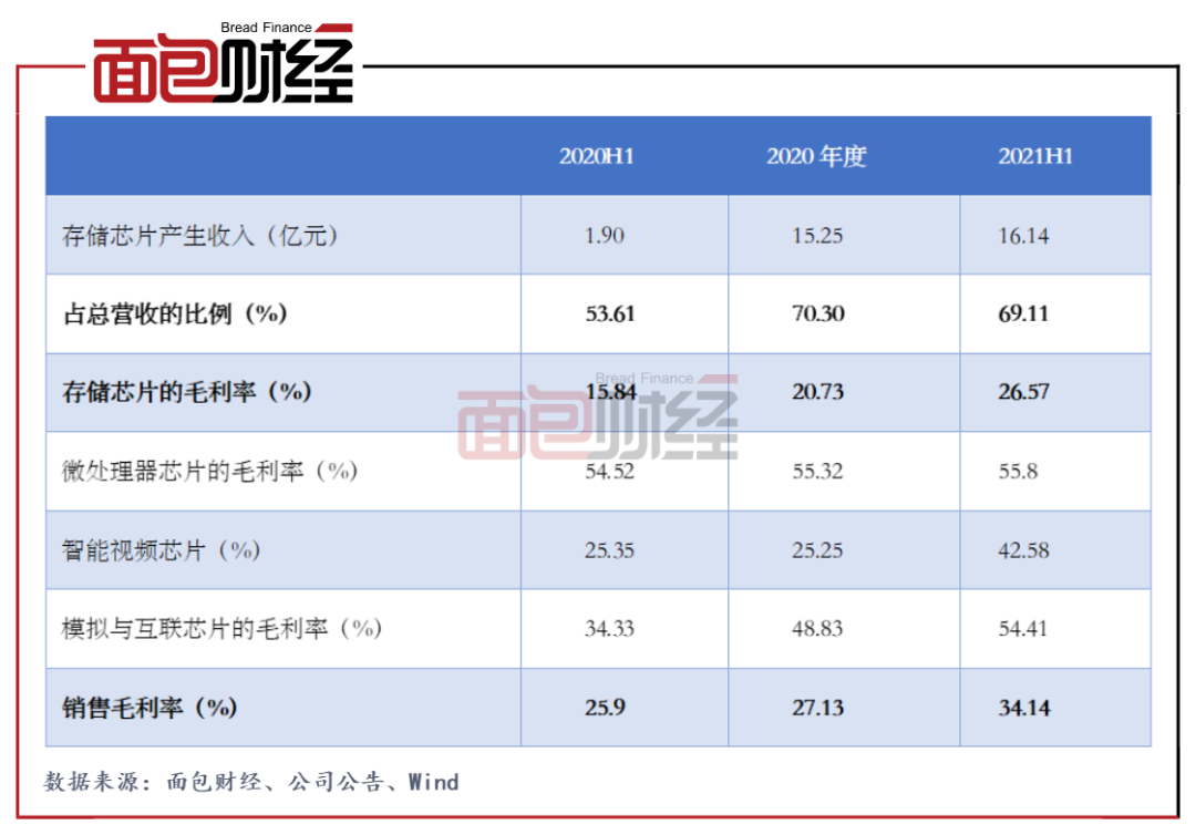 图4:2020H1至2021H1北京君正各产品毛利率及销售毛利率