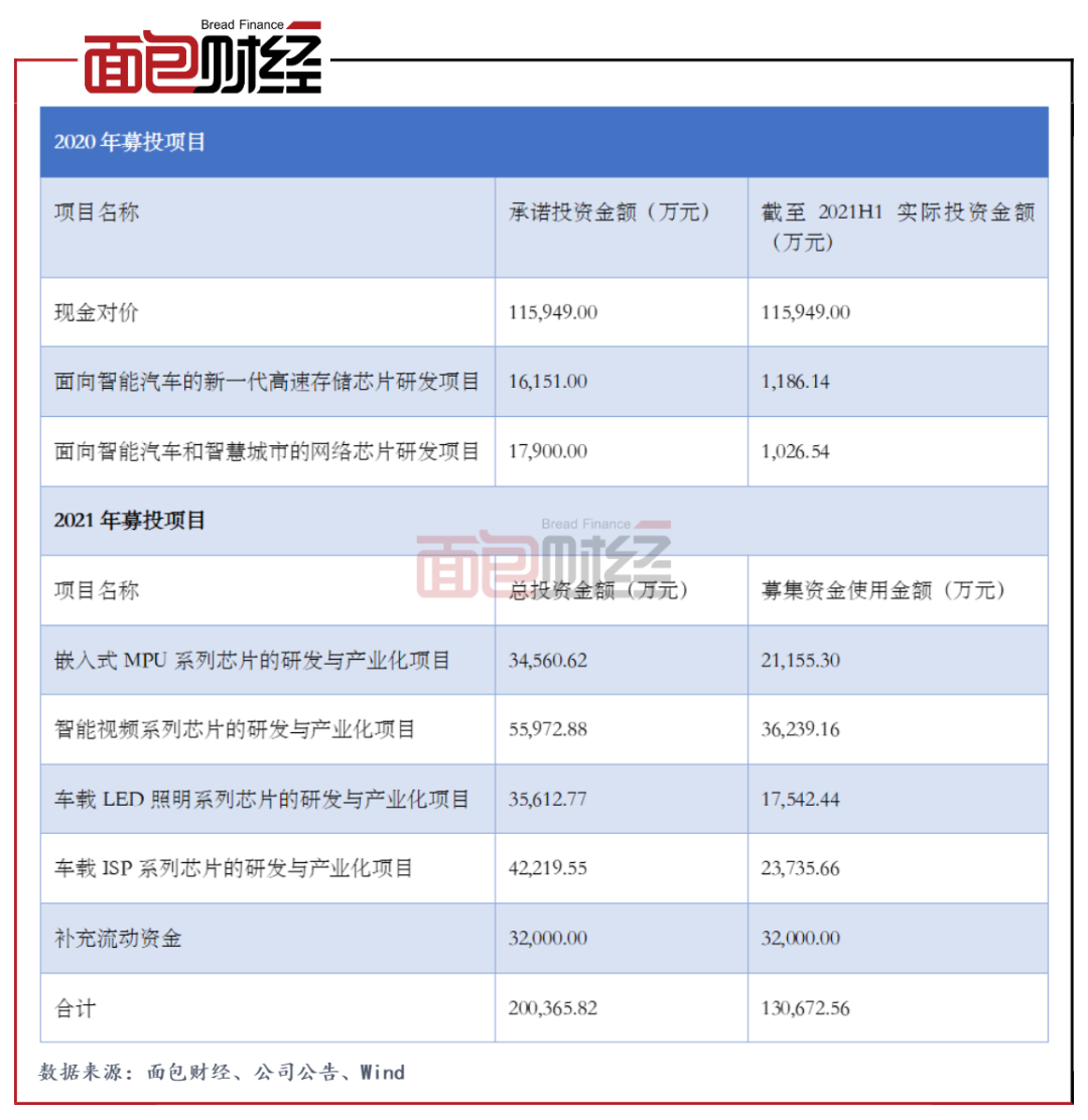 2020年的募投项目均为汽车行业类项目,资料显示,前次募投项目的进展较缓慢,新产品芯片的设计和研发可能存在难达预期或延期的风险。资料显示,截至2021年上半年末,两大芯片研发项目使用募集资金的比例均不达10%,其中,存储芯片研发项目中尚有产品仍处于设计阶段。