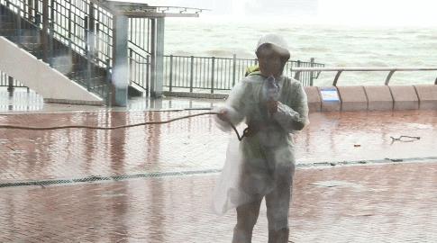 记者詹奕嘉在台风“妮妲”过境珠三角时采访。