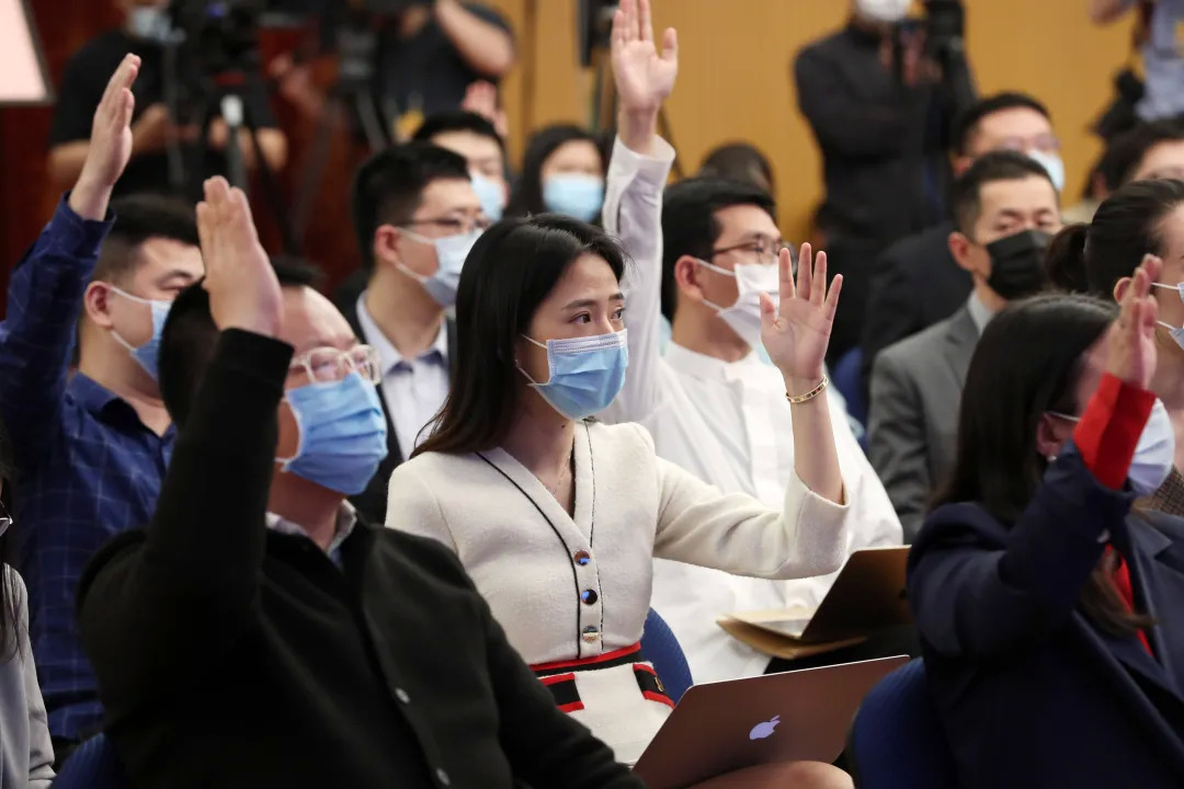 十三届全国人大四次会议在北京人民大会堂举行记者会,这是记者在位于梅地亚中心的分会场举手提问。新华社记者 金立旺 摄