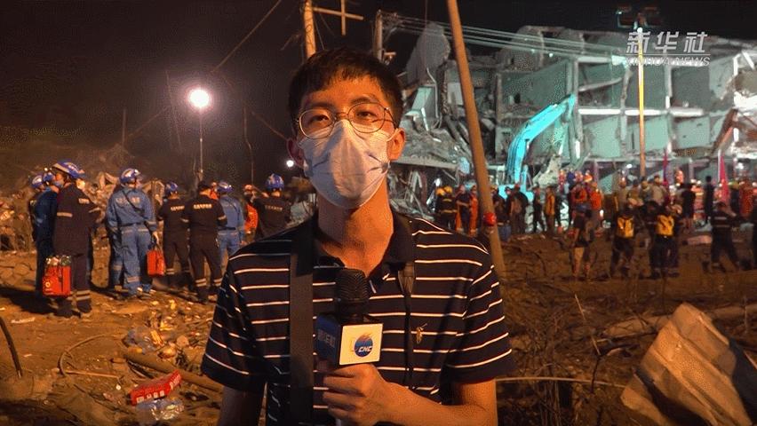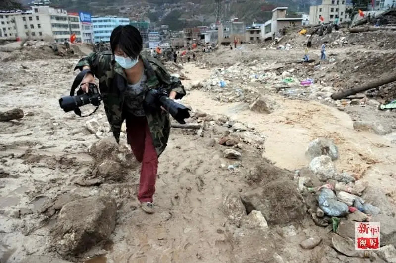 新华社记者刘潇在甘肃舟曲泥石流现场采访。