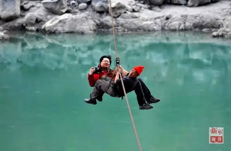 新华社记者蔺以光在云南怒江溜索过江。