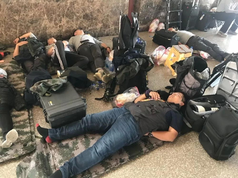 他们扛着沉重的设备狼狈前行