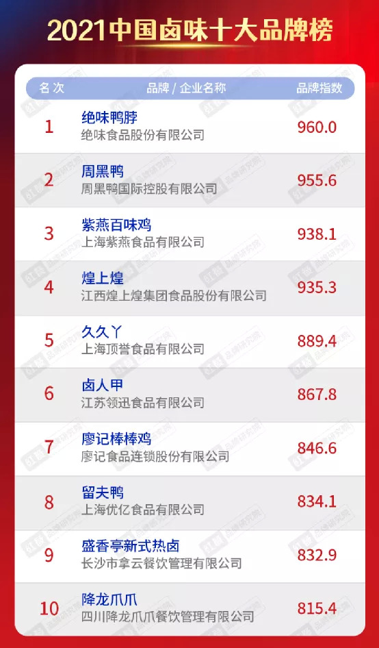 从2021中国卤味十大品牌发布的情况来看,绝味鸭脖、周黑鸭、紫燕百味鸡、煌上煌、久久丫、卤人甲、廖记棒棒鸡、留夫鸭、盛香亭新式热卤、降龙爪爪等品牌上榜。