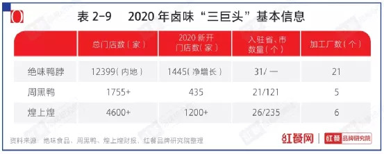 一直以来,卤味行业都有着“三国鼎立”的说法。无论是品牌势能还是渠道门店,绝味、周黑鸭和煌上煌等头部品牌一直牢牢站稳前三的位置。据不完全统计,截至2020年末,绝味鸭脖门店数达到12000余家,周黑鸭 1700余家,煌上煌4600余家。