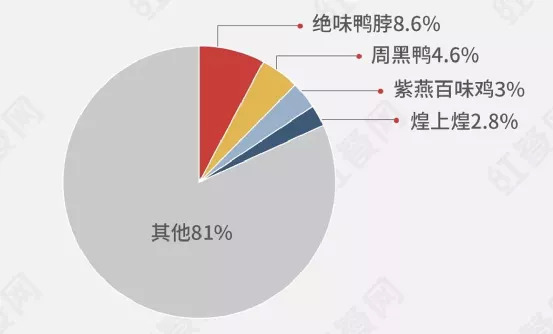 总体来看,整个卤味品类市场仍然是以小作坊经营模式为主。虽然随着消费升级带来品牌消费增多,行业品牌化趋势明显,但目前来看市场品牌集中度还很低,大大小小的品牌分食着市场份额,冒头机会依然很大。