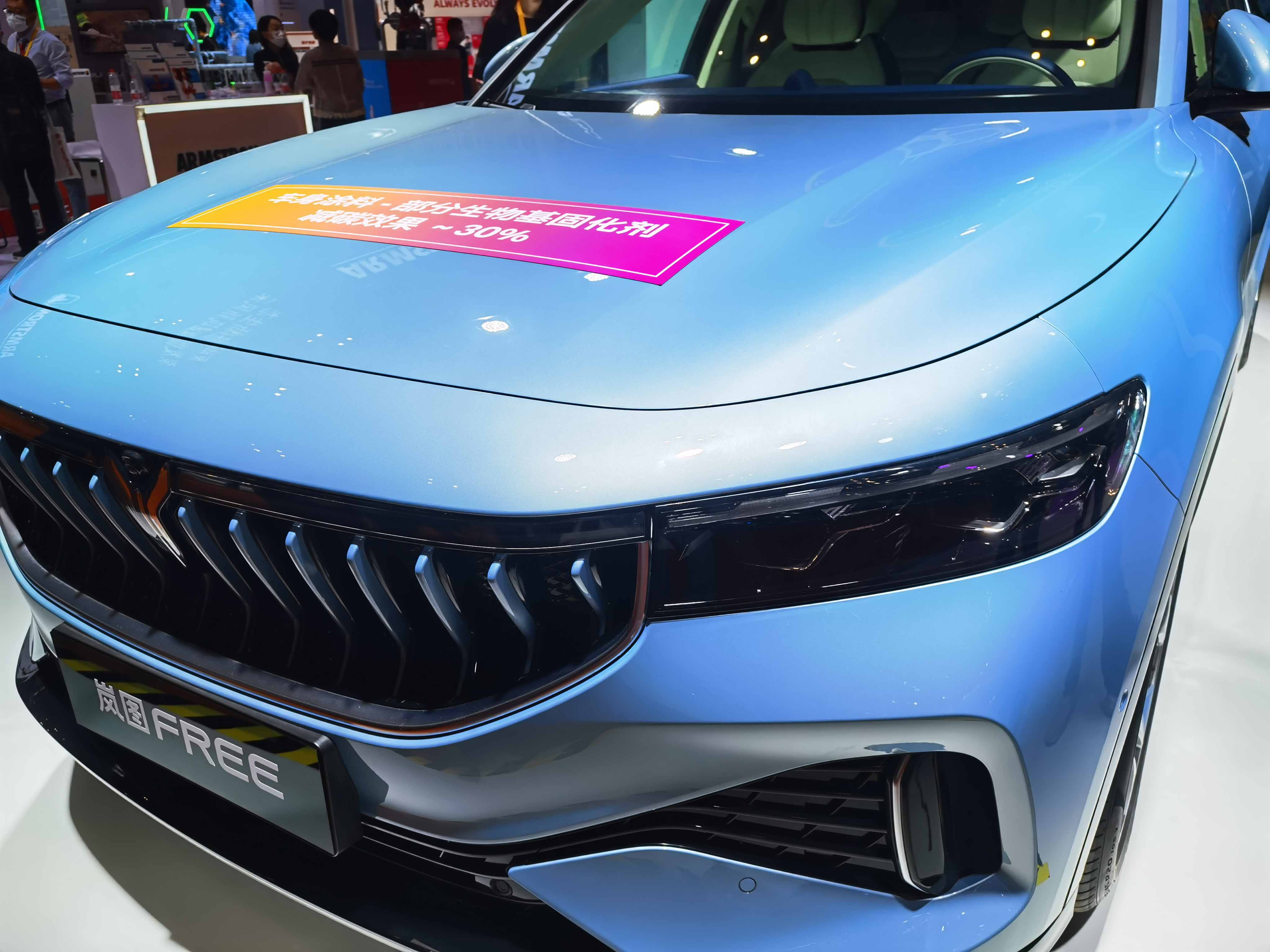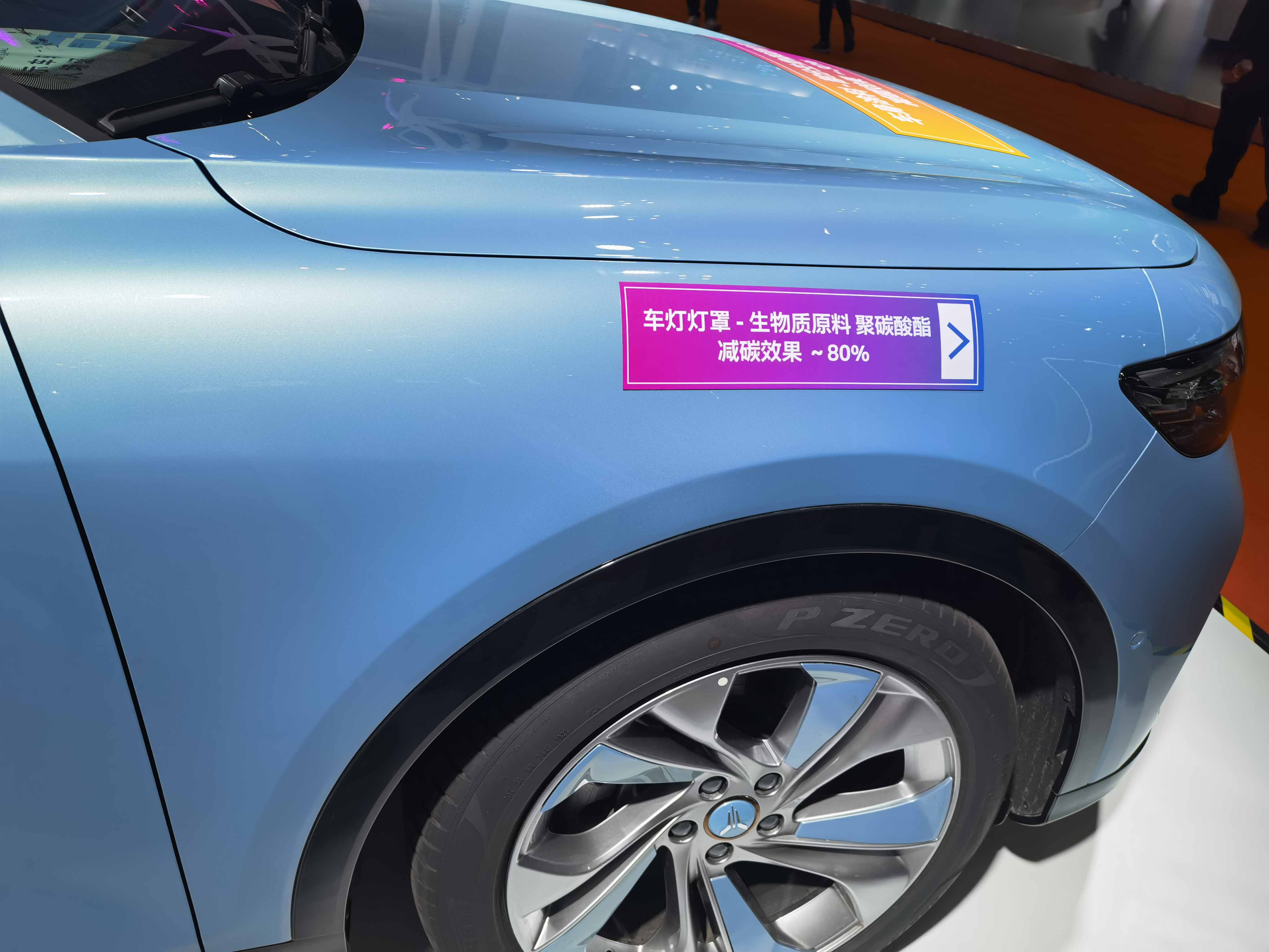 展台上,摆放了一辆东风汽车集团旗下的岚图汽车。该车的前大灯灯罩,由科思创低碳足迹聚碳酸酯制成,在材料端可减少80%的碳排放。车身使用来自科思创的部分生物基汽车清漆固化剂,在材料端可减少30%的碳排放。