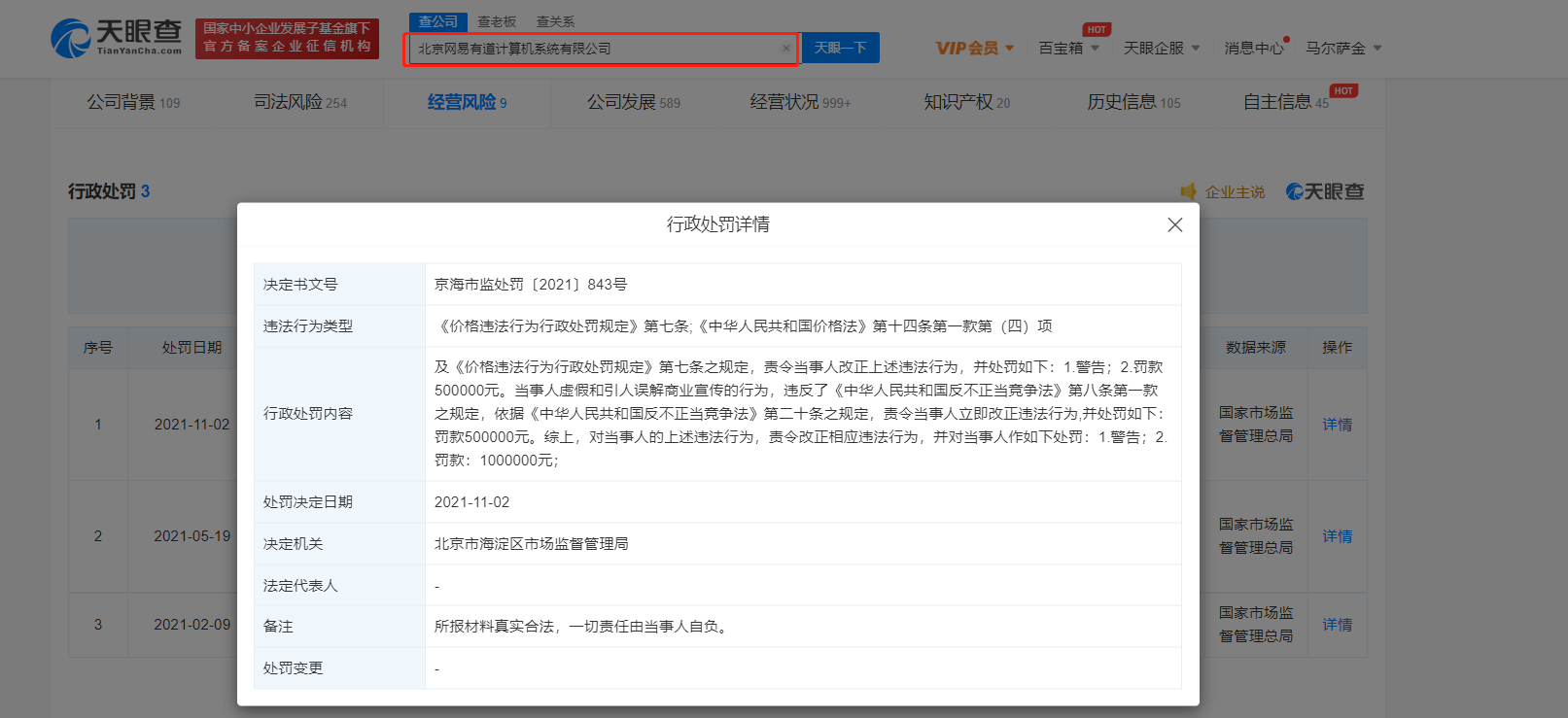 同日,北京网易有道计算机系统有限公司也因存在价格违法行为、虚假和引人误解商业宣传行为,被行政处罚100万。