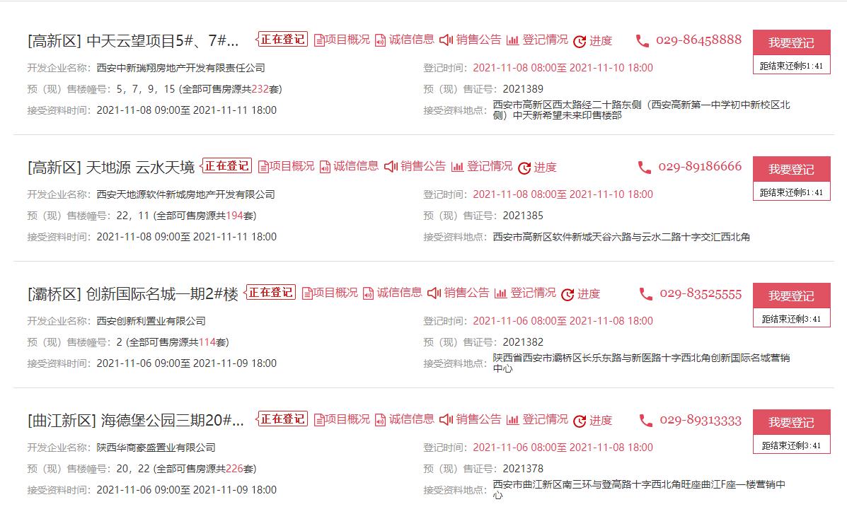 11月8日,西安市商品住房销售公示平台,四个项目开始线上登记,具体为高新区有中天云望项目(未来印)、天地源云水天境、灞桥区创新国际名城以及曲江新区的海德堡公园。