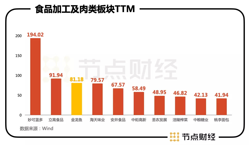 另据WIND数据显示,目前金龙鱼的TTM(动态市盈率)为81.18倍,食品加工与肉类板块的中位数为40.33倍,公司估值仍处于较高位置。