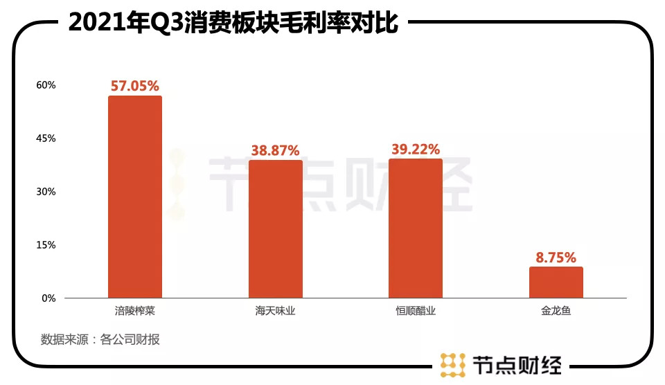公开的财报数据显示,A股6家粮油加工上市公司中,今年三季度毛利率最高的深粮控股为11.47%,金龙鱼8.75%排名第二,第三名道道全排名6.51%。与此相比,同期调味发酵品行业,排名第一的涪陵榨菜毛利率为57.05%,恒顺醋业39.22%,海天味业38.87%,差距一目了然。