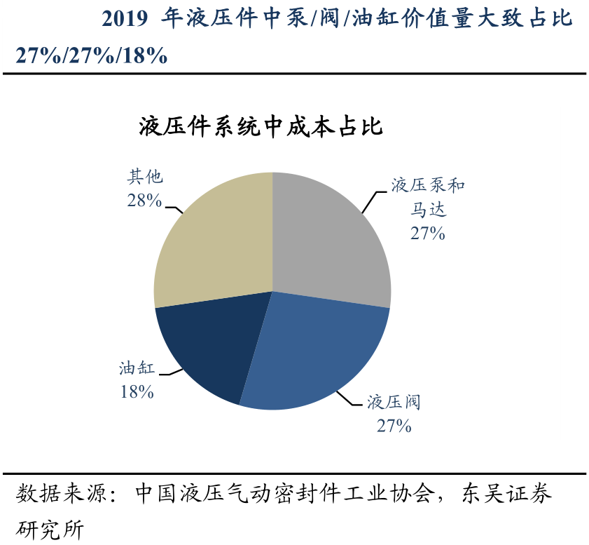 在液压件系统中,油缸、泵、阀、马达技术壁垒及价值量比较高。根据中国液压气动密封件工业协会数据,挖机液压件系统中液压泵和马达、液压阀、液压油缸价值量占比分别为27%、27%和18%。