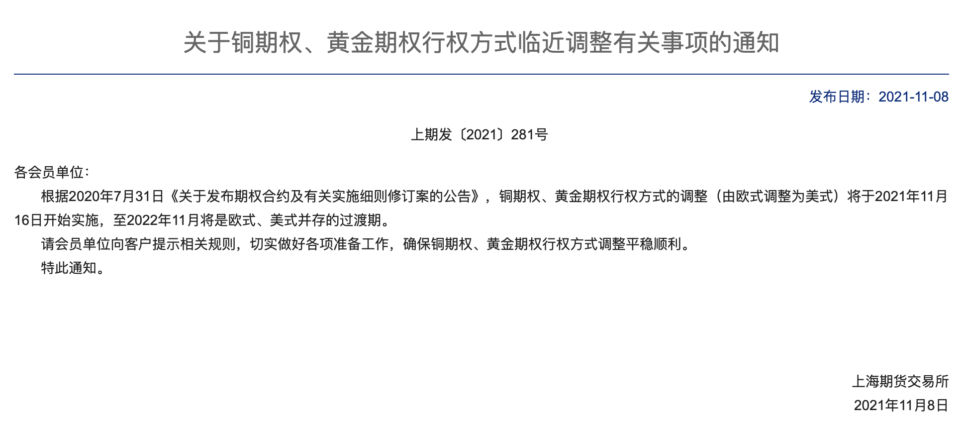 11月8日,上期所公告,根据2020年7月31日《关于发布期权合约及有关实施细则修订案的公告》,铜期权、黄金期权行权方式的调整(由欧式调整为美式)将于2021年11月16日开始实施,至2022年11月将是欧式、美式并存的过渡期。