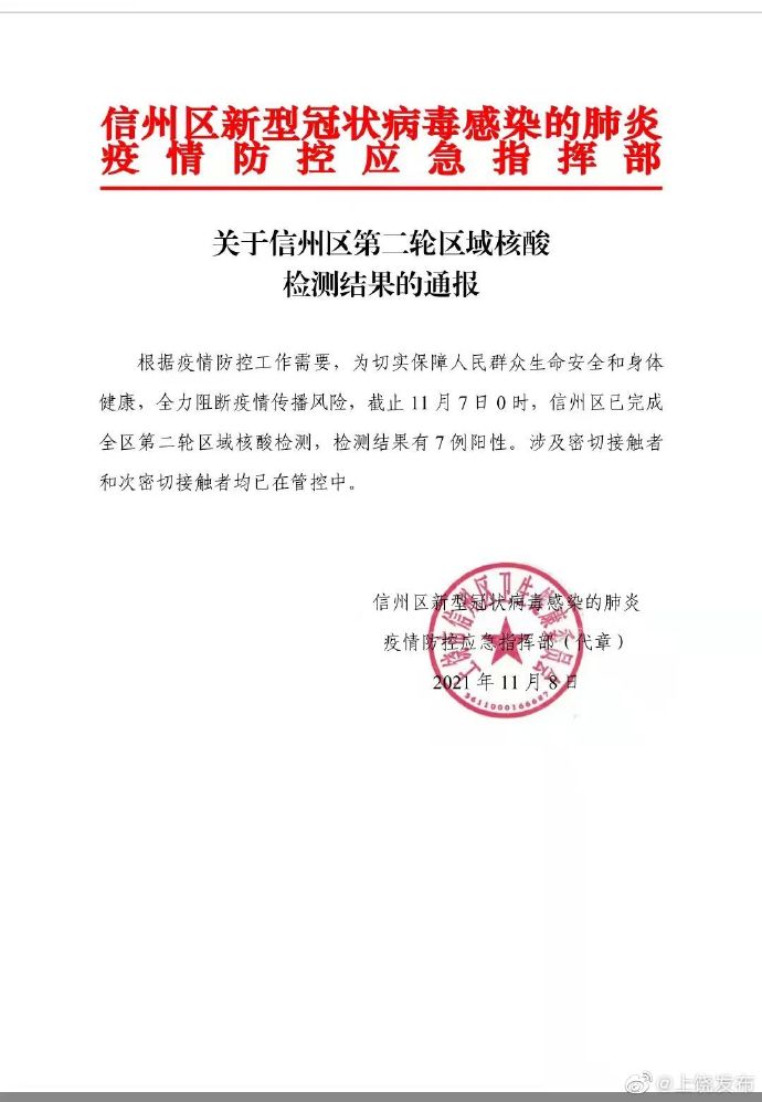 据江西省上饶市政府新闻办公室官方微博,江西省上饶市信州区新冠肺炎疫情防控应急指挥部8日发布通报,截止至11月7日0时,信州区已完成全区第二轮区域核酸检测,检测结果有7例阳性。涉及密切接触者和次密切接触者均已在管控中。