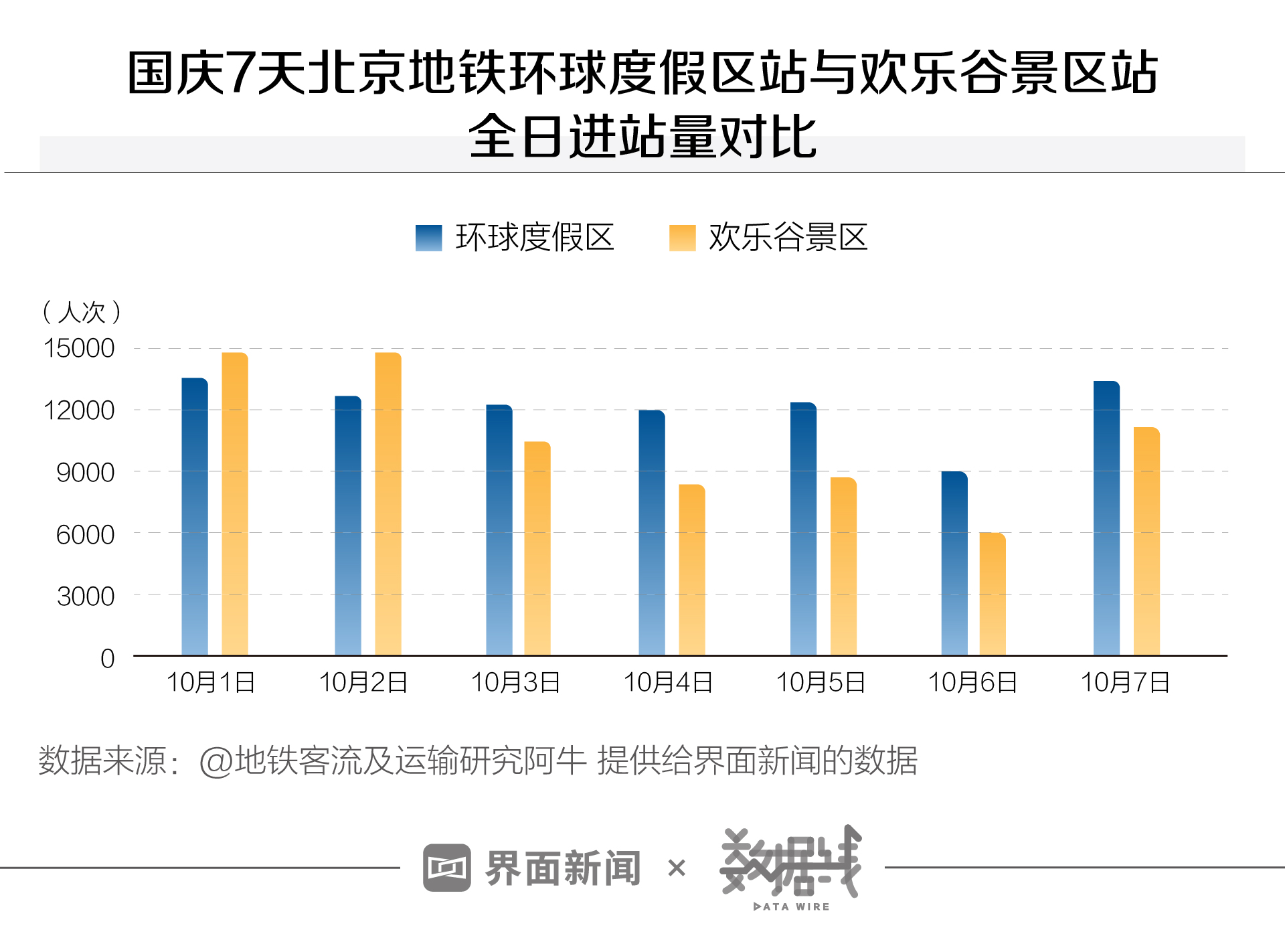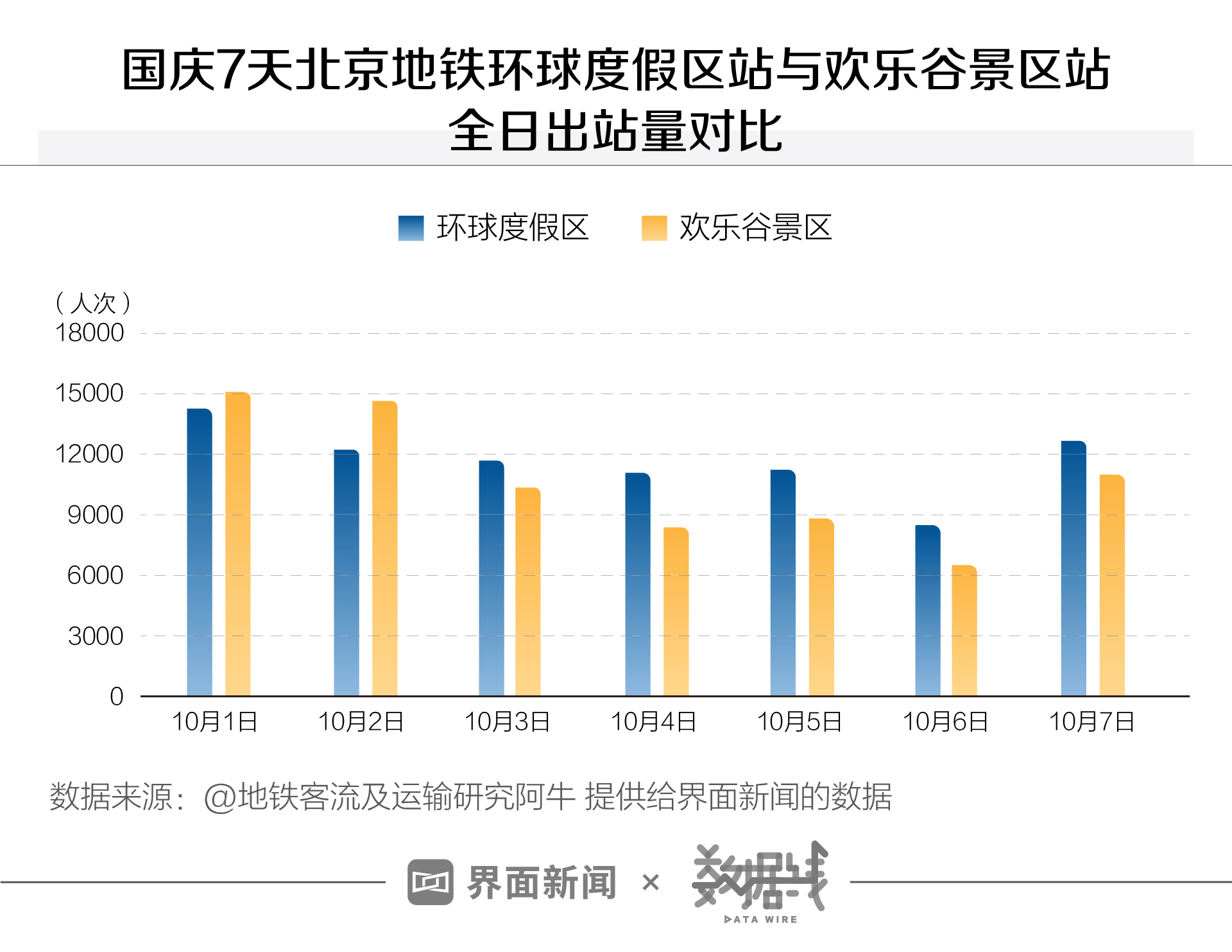 数据显示,国庆期间环球度假区的地铁客流量总体超过欢乐谷景区。