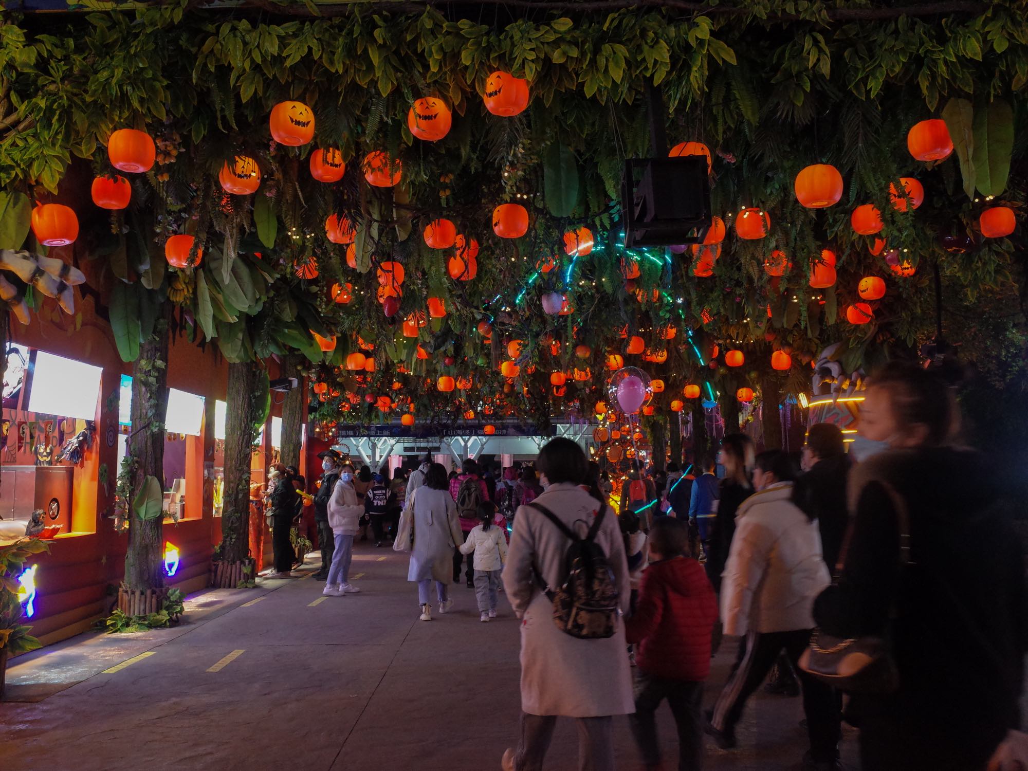 今年万圣夜的北京欢乐谷,也在社交媒体上火了。随处可见的南瓜等万圣节经典元素装点园区,身着奇异装束的高颜值NPC(非角色玩家)穿梭在人群中,不时与游客互动——从10月中旬开始,北京欢乐谷开启了长达一个月的“假面糖果节”。夜幕刚降临,几个“鬼屋”门前就已经排起长队,其中不少年轻游客专为这里的沉浸式游戏而来。