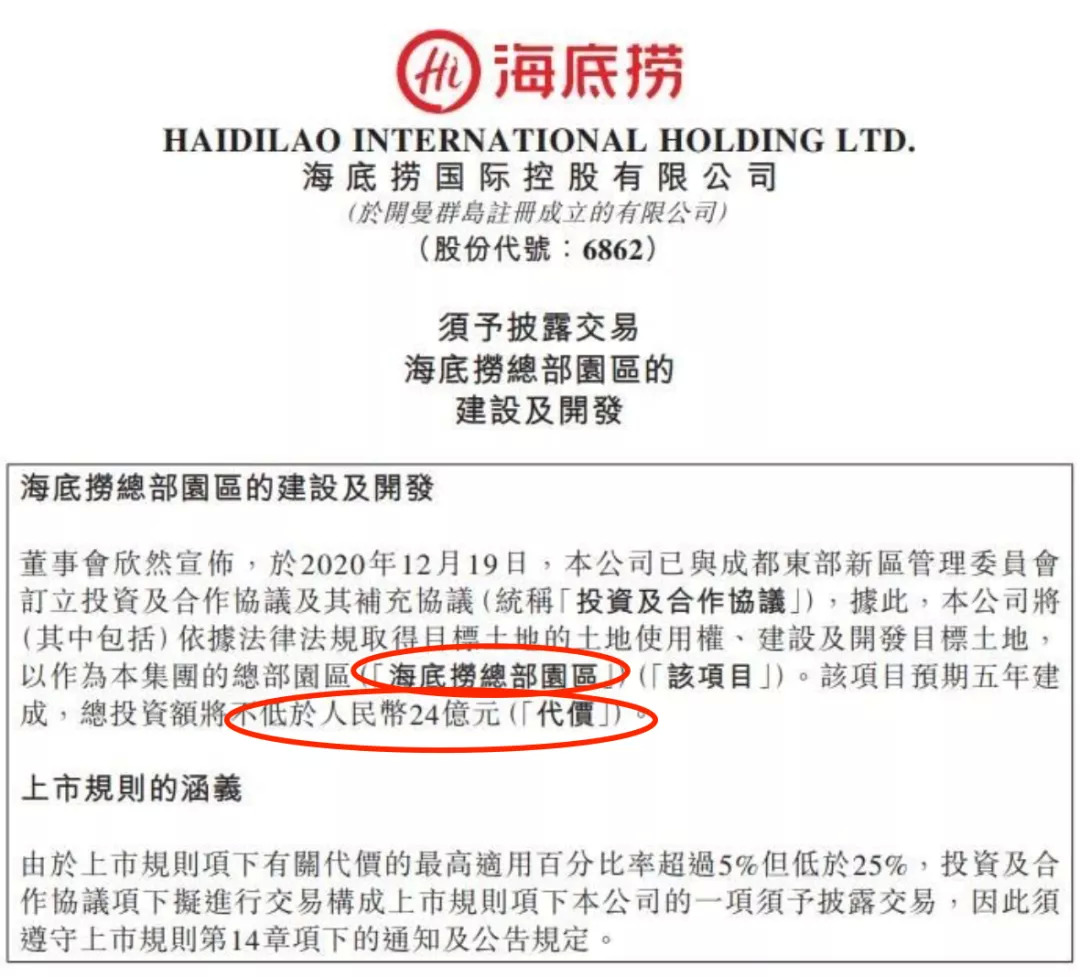 作为行动,去年12月,海底捞发布公告称,与成都东部新区管委会订立投资及合作协议及其补充协议,在东部新区建立集团总部园区(海底捞总部园区),总投资额将不低于人民币24亿元。