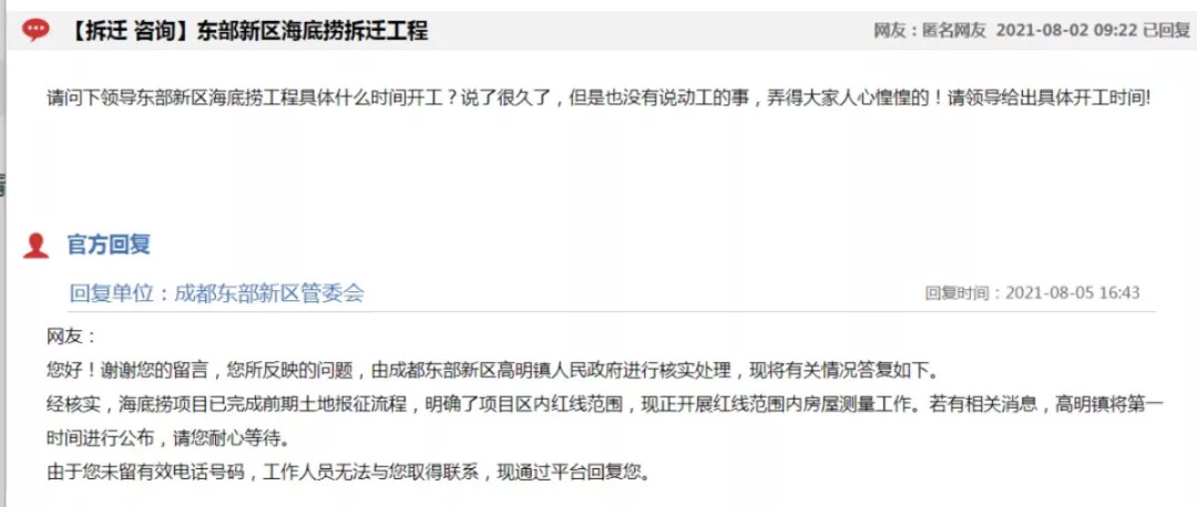 成都东部新区管委会则答复称,海底捞项目已完成前期土地报征流程,明确了项目区内红线范围,现正开展红线范围内房屋测量工作。