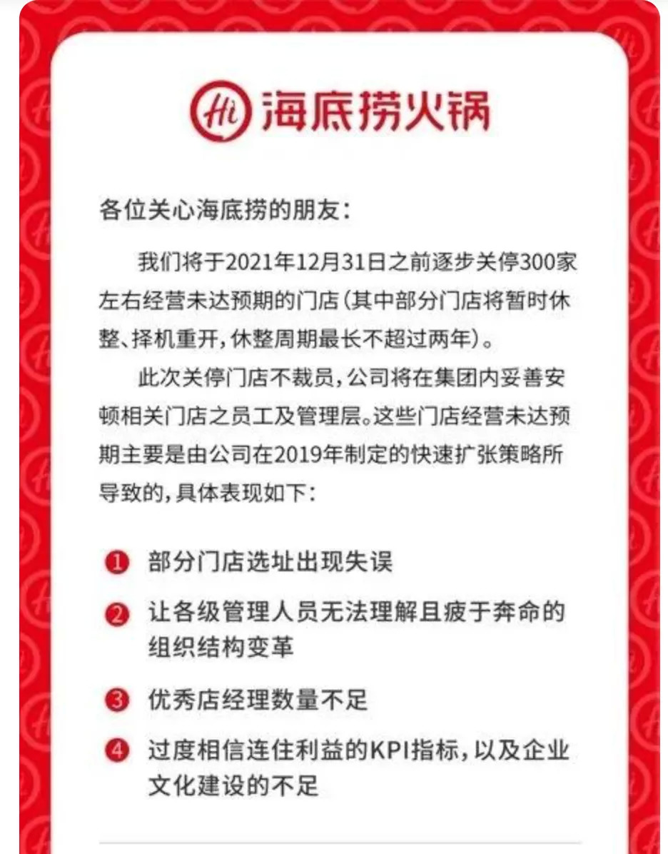 对于砍掉300家门店,海底捞的补充信息是——其中部分门店将暂时休整、择机重开,休整周期最长不超过两年,且强调本公司不会裁员并会于本集团内妥善安顿该等门店的员工。