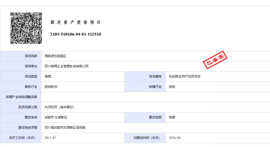 西部菌查询“东部新区在线”发现,今年3月,有消息称,海底捞总部园区项目计划今年7月开工。