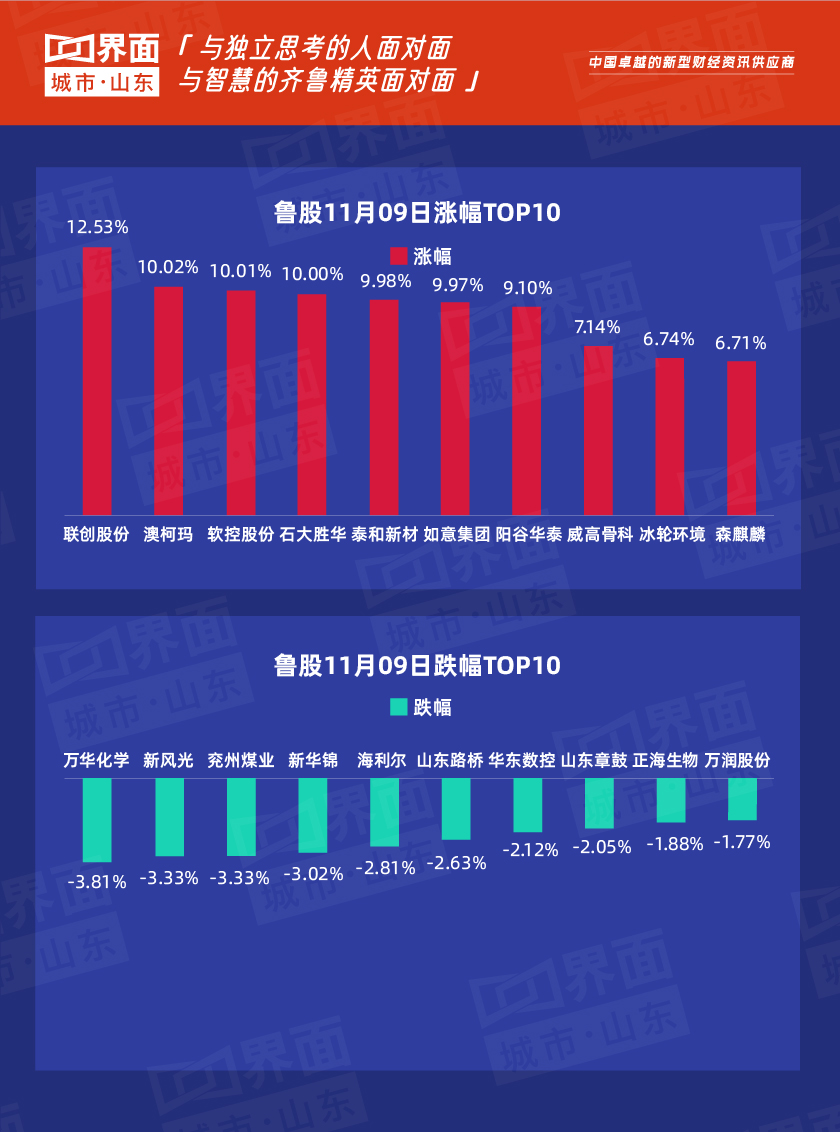 受大盘影响,11月9日,山东省内沪深股票有172只个股上涨,75只下跌,联创股份领涨。