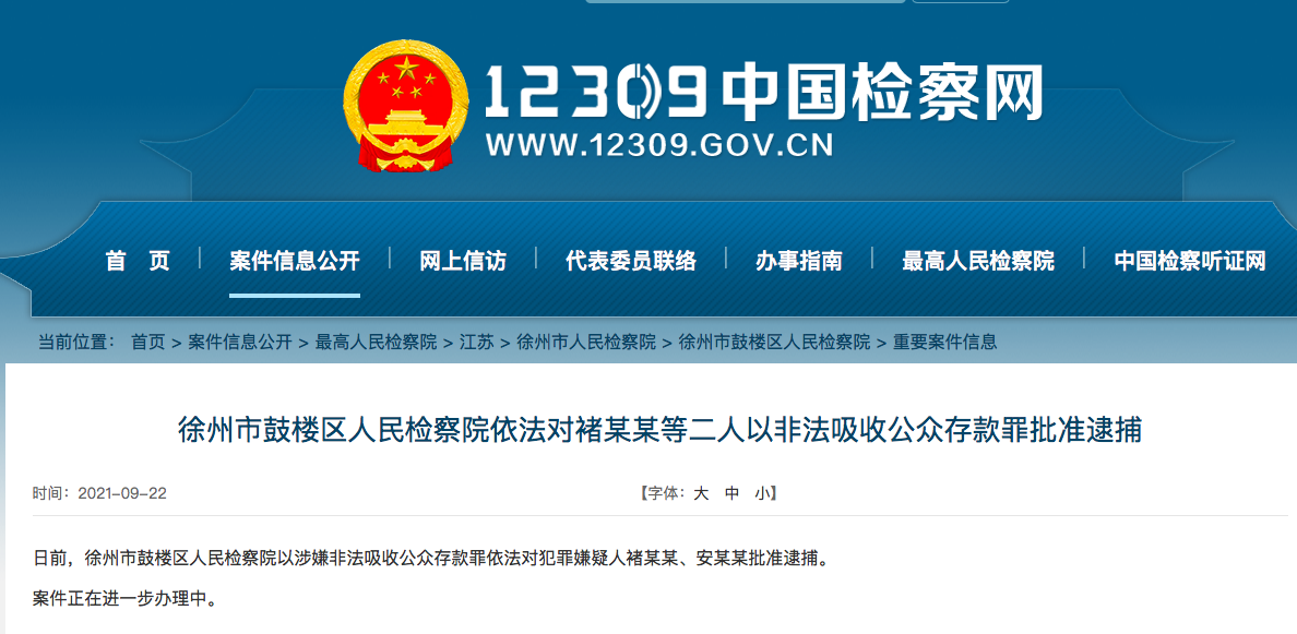 9月22日,一条名为“徐州市鼓楼区人民检察院依法对褚某某等二人以非法吸收公众存款罪批准逮捕”的重要案件信息显示,日前,徐州市鼓楼区人民检察院以涉嫌非法吸收公众存款罪依法对犯罪嫌疑人褚某某、安某某批准逮捕,案件正在进一步办理中。