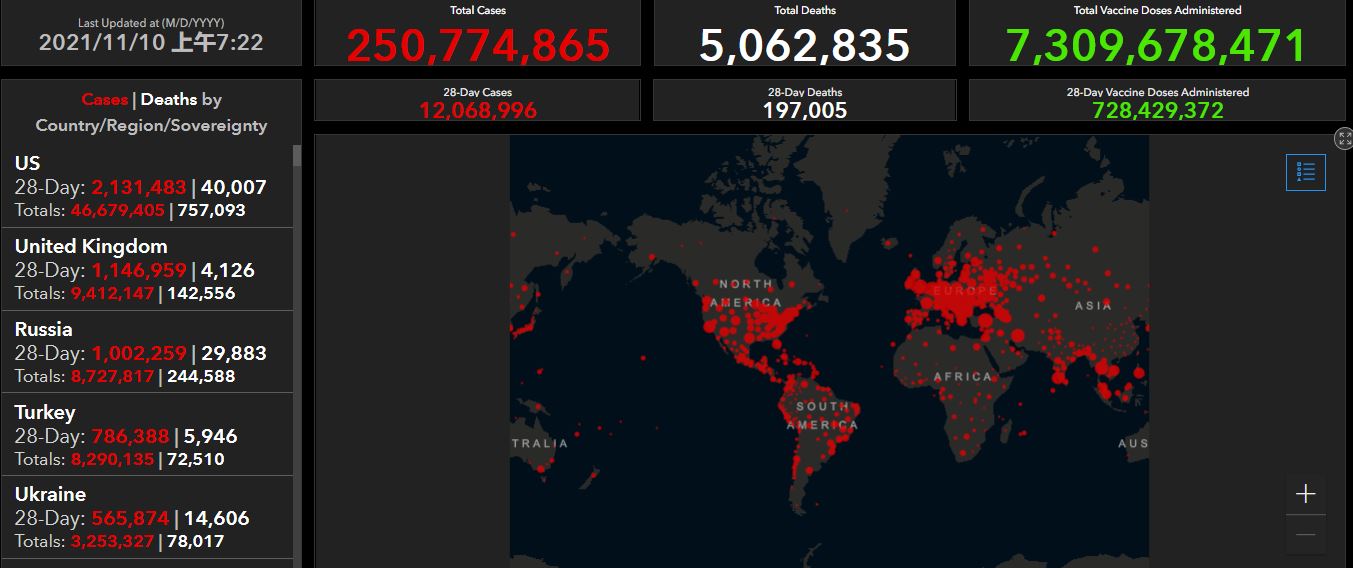 据约翰·霍普金斯大学的疫情追踪数据,截至北京时间11月10日上午8点,全球累计确诊新冠肺炎病例250774865例,累计死亡5062835例,接种疫苗超73.09亿剂次。