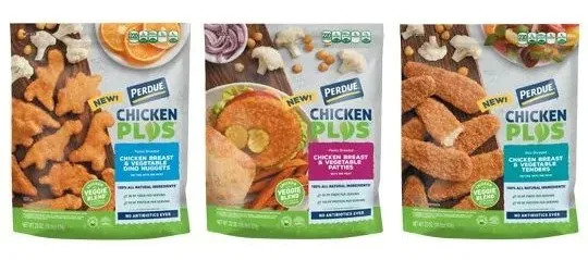 PERDUE CHICKEN PLUS 是一款富含蔬菜成分的鸡块。由鹰嘴豆,花椰菜与鸡肉混合而成,纯天然成分,不含抗生素,造型为孩子们喜欢的恐龙形状。每份产品采用100%天然成分,含有10克蛋白质,不含抗生素。这些鸡块可以与喜欢的蘸酱一起食用,甚至可以作为意大利面配料。