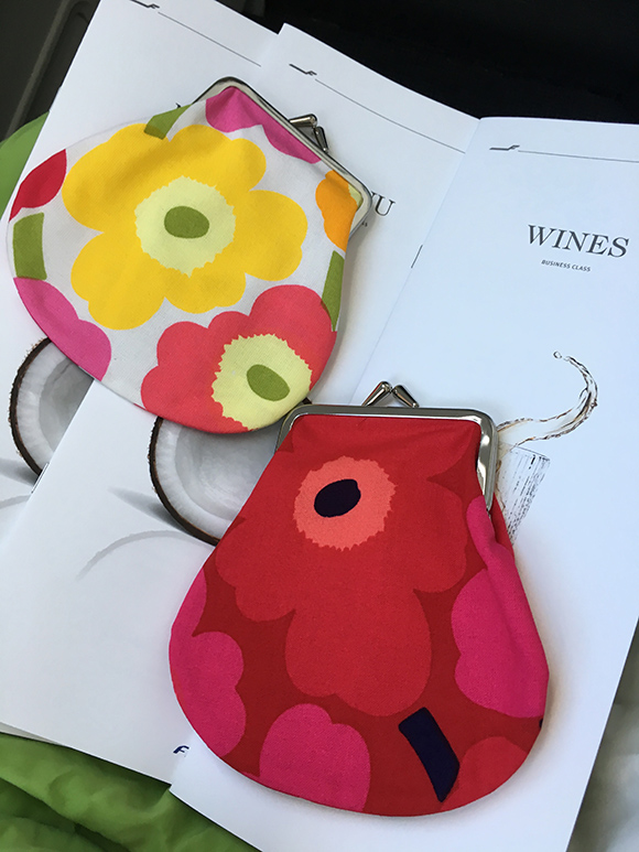 收到了首航的小纪念品,值得一提的是,所有芬航使用的这种颜色鲜艳、有着圆点或和花朵图案的设计均是和自芬兰最为知名的时尚设计品牌——Marimekko合作制作的。