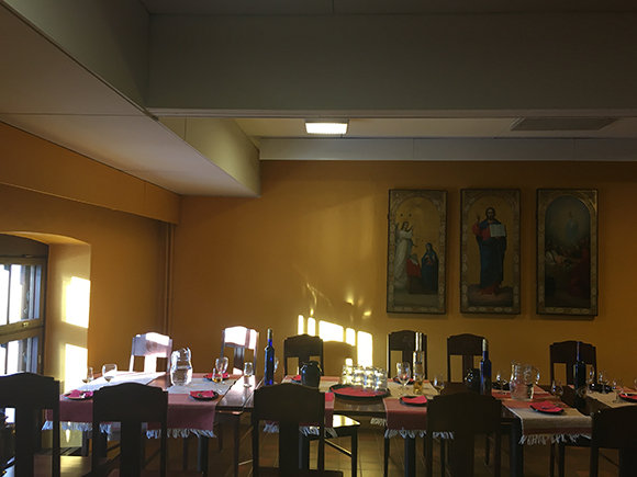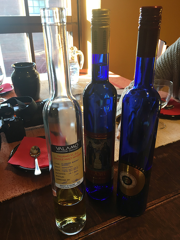 东正教的教规是可以喝酒的,美酒让禁欲的修士们也有点贪杯。晚餐由胖胖的修士陪同。他兴冲冲地带我们喝上了酒,还没吃上饭,就从清爽的白葡萄酒一路喝到威士忌。而修士的生活因为相对比较简单,所以他们会花上更多的时间与精力去酿造美酒,这才是修道院美酒最为难得的地方。而这里的晚餐,比起赫尔辛基来则更接近俄罗斯口味,大量的洋葱和三文鱼、白鱼等鱼类,配上能够祛寒的自酿烈酒,妙不可言。