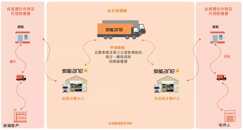 三人结成“铁三角”后,创新推出了货运合作商的平台模式,即“中心直营+网点加盟”。据IPO招股书解释,揽件与派送环节交给合作商或代理商,集散分拨、路线规划、干线运输均由安能物流运营。