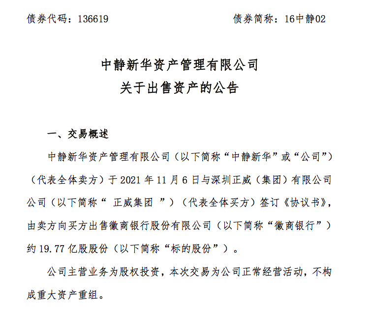 11月9日,作为“16 中静 02”公司债券的发行人,中静新华资产管理有限公司(下称中静新华)公告称,中静新华(代表全体卖方)于2021年11月6日与深圳正威(集团)有限公司(下称正威集团 )(代表全体买方)签订《协议书》,由卖方向买方出售徽商银行(03698.HK)约19.77亿股股份。
