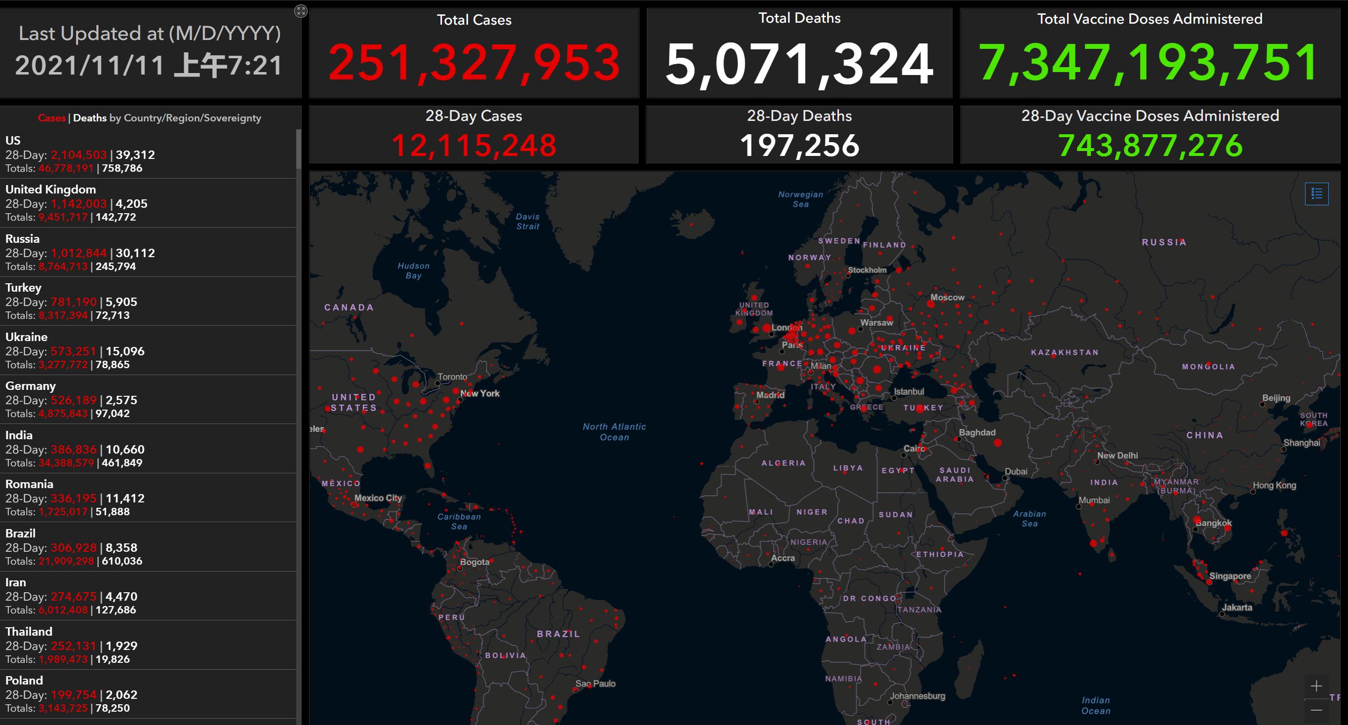 据约翰·霍普金斯大学的疫情追踪数据,截至北京时间11月11日上午8点,全球累计确诊新冠肺炎病例251327953例,累计死亡5071324例,接种疫苗超73.47亿剂次。