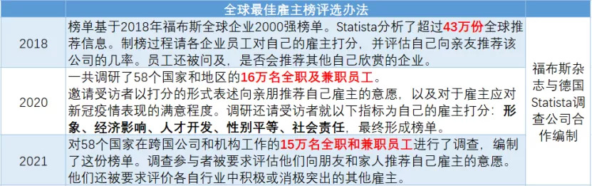 最佳雇主榜单是福布斯与德国市场研究公司Statista合作编制。评价依据主要是受访者给自己雇主的打分,涉及企业形象、经济影响、人才发展、性别平等和社会责任等多方面维度。