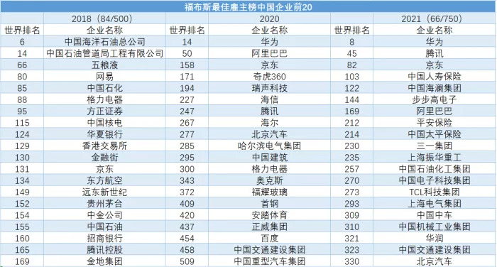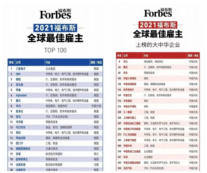 10月12日《福布斯》杂志发布了2021全球最佳雇主榜,榜单包括了评选范围内750家评分最高的企业。
