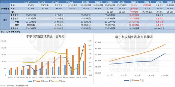 如下图,从2018年开始,李宁线上、线下流水,都以双位数加快增长;同时,营收和毛利率情况也大幅增长。安踏也有出色表现。