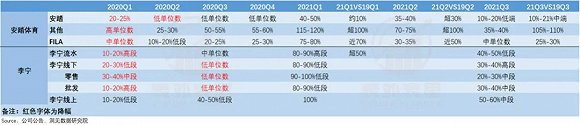 如下图,李宁2021Q1、Q3流水分别为80-90%高端增长和40-50%高端增长;同期安踏则为40-50%高端增长和10-20%低端增长。